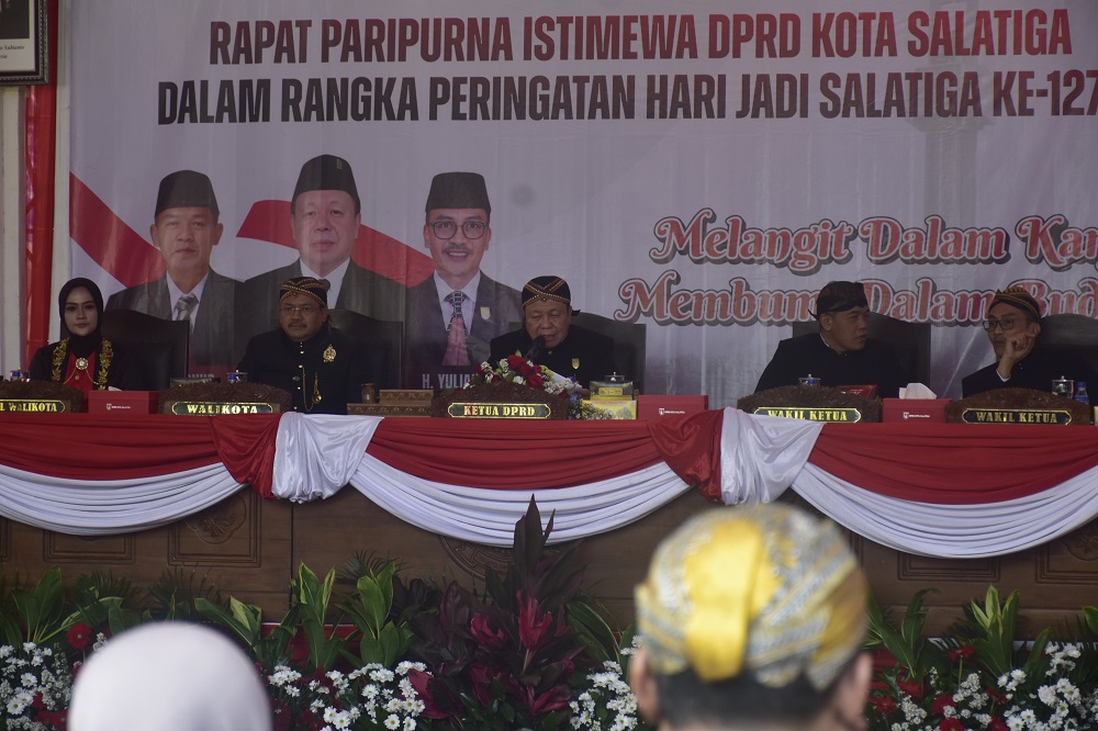 Dewan Perwakilan Rakyat Daerah (DPRD) Kota Salatiga mengadakan Rapat Paripurna Istimewa dalam rangka memperingati Hari Jadi ke-1.275 Kota Salatiga berlangsung di Alun-alun Lapangan Pancasila, Kota Salatiga, pada Kamis (24/07/2025).