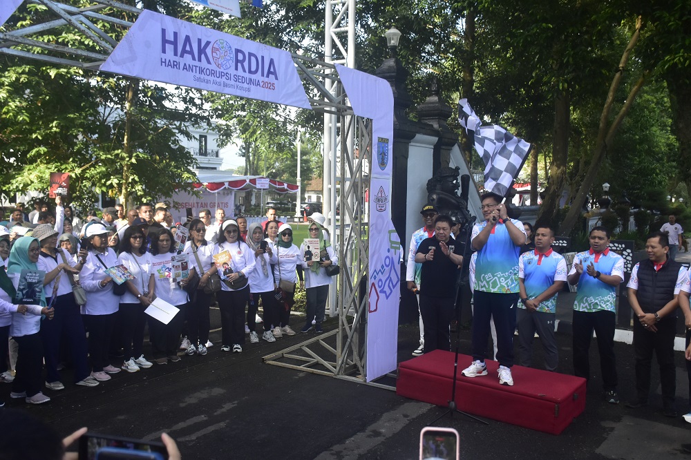 Wali Kota Salatiga, dr. Robby Hernawan, Sp. OG, didampingi Forkopimda, secara resmi membuka kegiatan dengan pengibarab bendera start untuk menandai dimulainya Jalan Sehat Antikorupsi Sedunia.